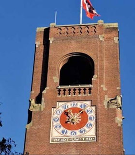 Damrak 243: tekst 'Beidt uw tijd' op de klokkentoren van de Beurs van Berlage
