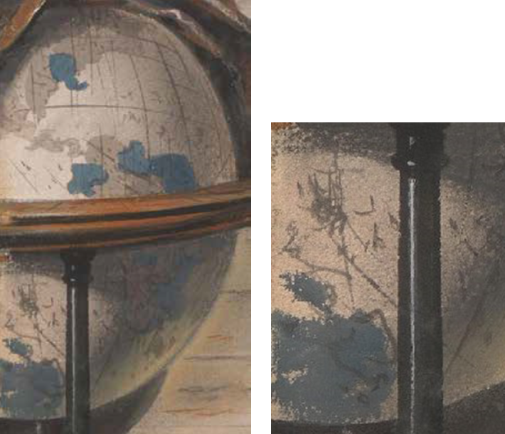 - Op een globe is een opvallende kleur blauw te zien binnen de contouren van Florida, evenals rond de kustlijnen van Midden- en Zuid-Amerika. Ook zijn er twee ruw geschetste schepen die Kaap Hoorn leken te hebben gerond.