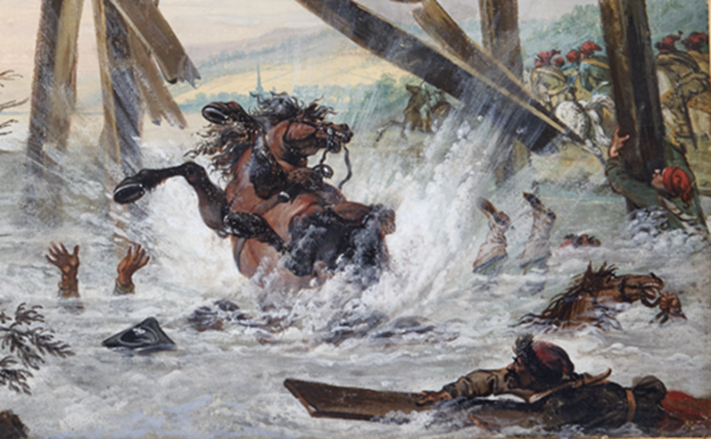Cornelis Troost, Ruiterslag op een instortende brug, 1741, Armémuseum, Stockholm, fragment.