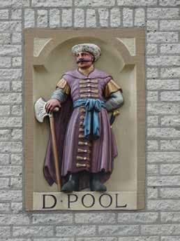 Gevelsteen D’Pool die was gemetseld in pakhuis De Pool, de statie Sint Anna van Gerard van Wijckersloot aan de Ygracht (Amsterdam).