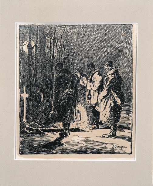 Een voor een vallen kameraden weg. Tekening Joseph Lesage