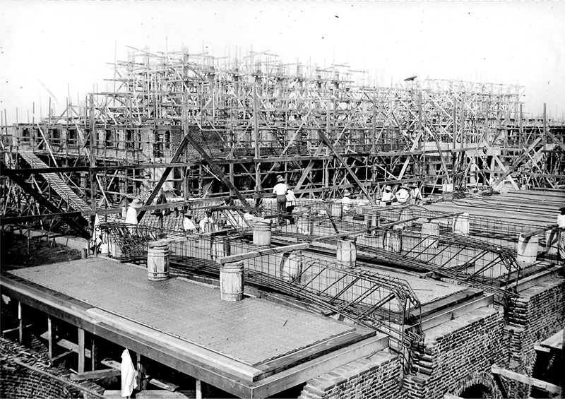 De bouwplaats van het kantoorgebouw van de Gouvernementsbedrijven in Bandoeng (Bandung). Architect: Johan Gerber. Geopend: 1924.