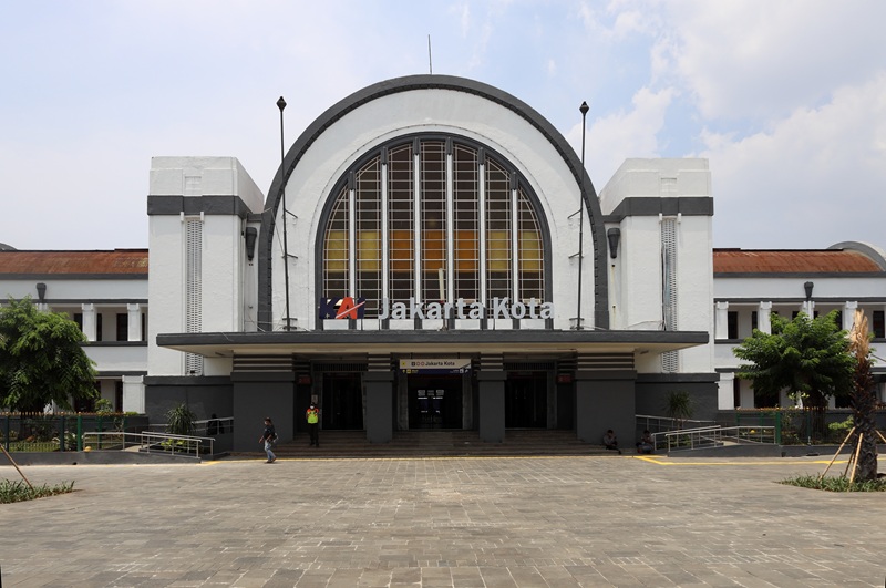 De hoofdentree van het treinstation in het oude stadsdeel van Jakarta (Kota Tua). Architect: Frans Ghijsels. Geopend: 1929.